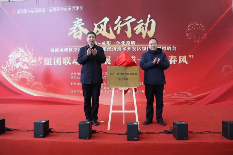 招聘会上,西咸新区社会事业服务局党委书记、局长宋亚森和空港新城党委副书记刘军分别介绍了就业服务领域的建设情况、2023年举办招聘会和各类就业促进活动的开展情况以及本次“春风行动”活动的有关情况。随后,与会嘉宾共同为西安—咸阳临空经济组团零工驿站、西安-咸阳一体化共享人才市场(空港新城分站)和空港新城人才市场揭牌并推动装置正式启动活动。