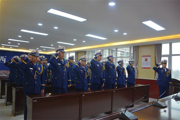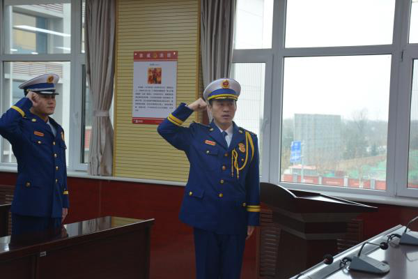 仪式上,大队长陈家庆宣读了消防救援人员授衔命令,教导员高风带领参加仪式的全体消防救援人员庄严宣誓。“我志愿加入国家消防救援队伍,对党忠诚,纪律严明、赴汤蹈火,竭诚为民,坚决做到服从命令、听从指挥,恪尽职守、苦练本领,不畏艰险、不怕牺牲,为维护人民生命财产安全、维护社会稳定贡献自己的一切......”铿锵有力的宣誓声表达着空港消防救援队伍牢记使命、践行誓言的坚强决心和信心。