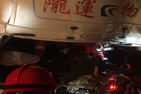 6时18分,中队救援力量到达现场。途中和报警人取得联系了解情况,根据报警人联系得知,此车辆在行驶过程中,由于天气与车速过高的原因,导致车辆撞在墙上,车内一名人员被困,一人甩出车外。同时,现场没有明火迹象,排除爆炸危险。中队官兵赶到现场后,发现油罐车整个车头已经面目全非并且与墙体紧紧贴住,使救援难度加大。参战官兵立刻使用液压扩张器对车头变形部位进行扩张,并且将顶部的车门打开方便救援。7时02分,经过参战官兵不懈努力被困部位腾出足够大救援空间后将一名被困人员被成功救出,立即移交现场120医护人员送往医院救治,参战官兵收整器材准备返队。
