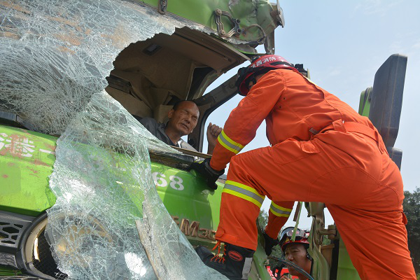 随后,利用主战车牵引机对事故车辆驾驶室扩张空间进行固定,一名指挥员携带液压顶杆,由车体前部进入副驾驶位置,对仪表台实施顶撑,打开足够的施救空间后,救援组与被困人员相互配合,采用抱式救助的方法,将被困人员成功救出,由120送往医院进行救治。