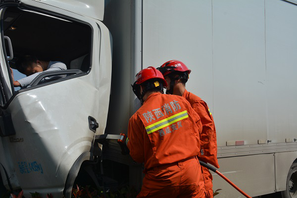 2019年9月30日11时时45分,空港新城消防救援中队接指挥中心派警称,北杜乡政府往自贸大道方向货车撞树上一人被困,中队立即出动两车十人前往处置。