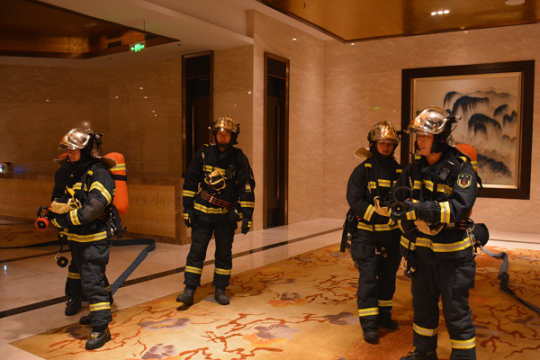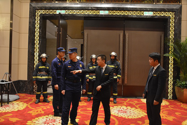 熟悉现场具体情况后,中队迅速组织开展无预案演练,并将人员分为灭火攻坚组、抢险搜救组、引导疏散组、预演供水组四组,指挥员指挥,开展救援准备工作。预演供水组利用水泵接合器进行供水,灭火攻坚组利用室内消火栓出两支水枪对现场进行处置,抢险救援组与引导疏散组分别对会场和客房进行人员疏散与搜救工作。演练结束后,司令部干部充分肯定了中队近期的安保工作,同时也指出了存在的些许不足,要求在安保工作开始前迅速整改。