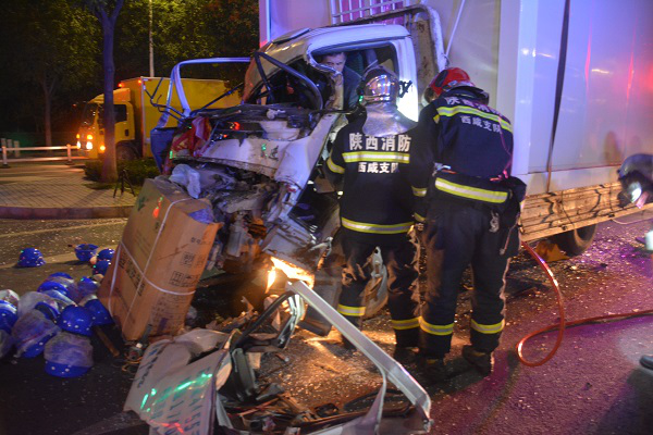 2019年10月30日23时47分,空港新城中队接指挥中心派警称:北杜自贸大道申通快递物流两车追尾一人被困。中队接警后迅速调派一辆主战车、一辆抢险车共计2车10名指战员迅速前往现场。\