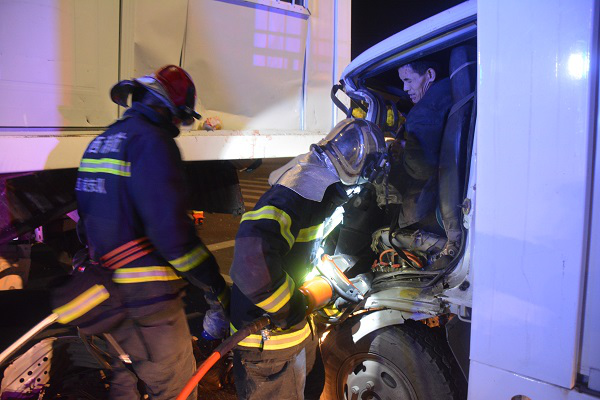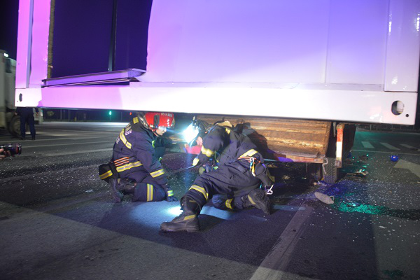 23时56分,中队迅速组织人员利用荷马特液压破拆工具组对驾驶室进行顶撑,并通过主战车对后车进行牵引。固定好施救空间后,指挥员发现该被困人员右腿失去知觉,无法正常屈伸完成配合工作,救援组与被困人员相互配合,采用抱式救助的方法将被困人员成功救出,并交由120送往医院进行救治。