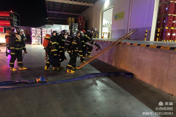 为进一步提升夜间大跨度大空间火灾事故的应急处置能力,切实提高全体队员在灭火实战中的协同作战和快速反应能力。2021年2月18日晚,景平大街消防救援站组织开展夜间灭火实战演练。演练假设辖区华翰物流园B仓库发生火灾,浓烟较大、无人员被困、无人员伤亡,工作人员迅速拨打119报警。接到报警后,景平大街消防救援站迅速出动5车23人赶赴现场。