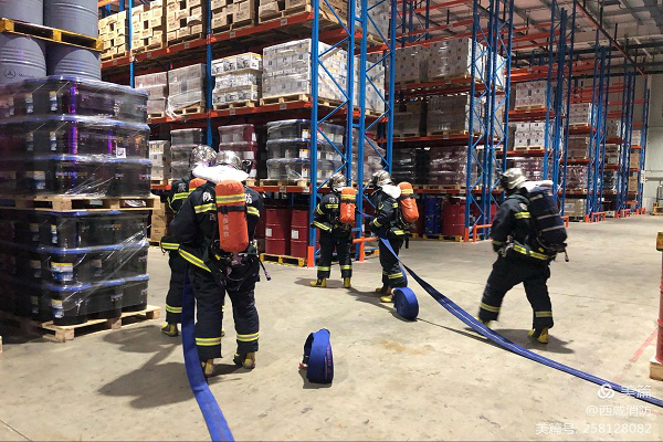 到场后,指挥员立即组织人员对现场知情人与消防控制室进行询情,结合反馈情况迅速部署作战任务。所有人员依照指挥员命令分成侦检组、灭火组、供水组,排烟组和警戒组,并严格按照分工展开行动。侦检组携带侦检器材对着火仓库进行侦检;灭火组铺设水带干线占据有利地形设置水枪阵地,采用双干线交替掩护控制火势防止蔓延;供水组利用室外消火栓对消防车进行供水确保火场供水不间断;排烟组选择有利位置架设排烟车辆;警戒组对火场周围道路实施封堵,并同微型站疏散人员。各小组动作敏捷、配合默契,经过40分钟的英勇奋战,“大火”被成功扑灭,此次演练圆满结束.