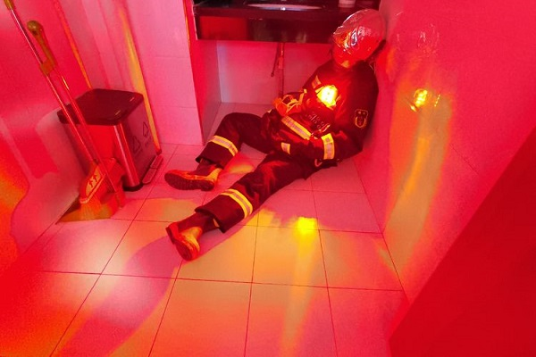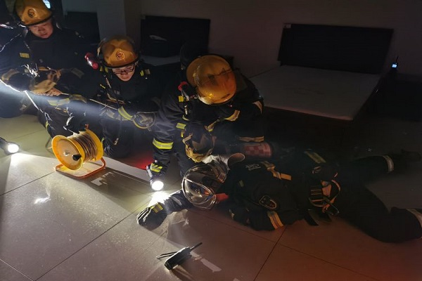 训练前,熊冰涛站长首先讲解灭火救援现场紧急救援小组的响应程序、人员分工及组成要素,强调了现场紧急救援的注意事项和实施要领。训练过程假设内攻班组在行动过程中突遇建筑坍塌、迷失、失联等情况,场外安全员发现失联情况后第一时间启动紧急救援小组响应指令,指派既定岗位人员成立紧急救援小组迅速开展救援。紧急救援小组人员携带手持电台、红外热成像仪、强光照明灯、发光导向绳等十余件套装备,通过沿水带搜索与沿墙搜索等方式迅速确定被困人员具体位置,快速利用火场紧急救助技术分别对被困指战员进行施救。