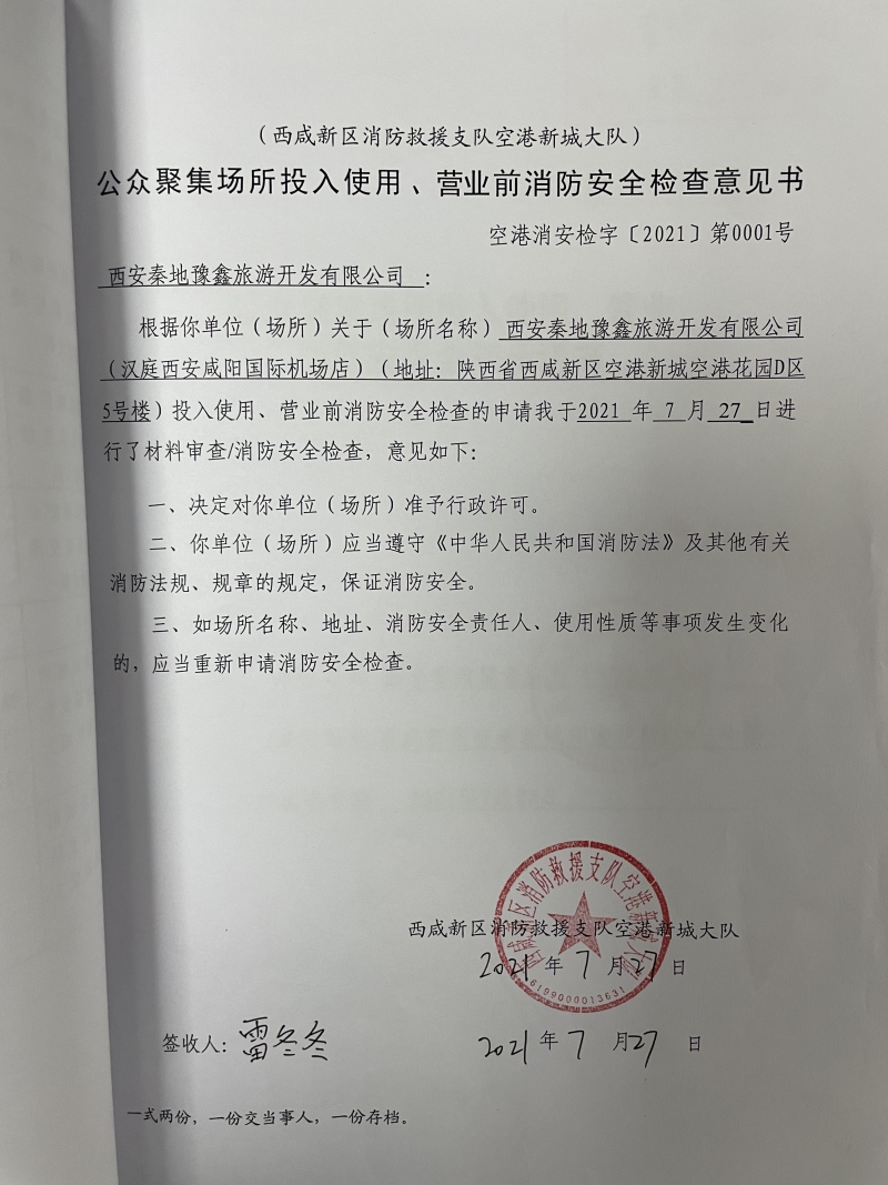 公众聚集场所投入使用、营业前消防安全检查意见书(西安秦地豫鑫旅游开发有限公司)