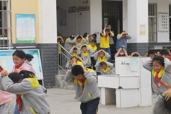 最后,宣传人员组织全校师生开展了火场逃生疏散演练及地震逃生疏散演练活动,随着一阵急促的警报声响起,学生们在老师的带领下,用手捂住口鼻,弯腰低头,穿过走道楼梯,按照疏散逃生路线,在老师的引导下快速有序的疏散至操场安全区域。