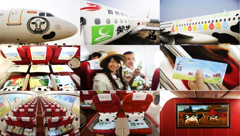 2.全系列品牌定制:如蒙牛“空中的牛奶生活家”主题专机,实现品牌全方位展示与体验。