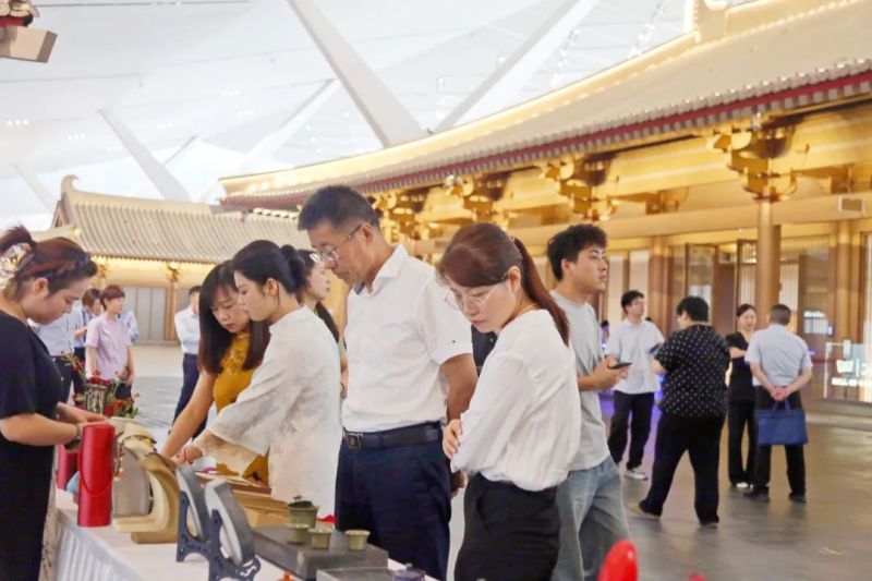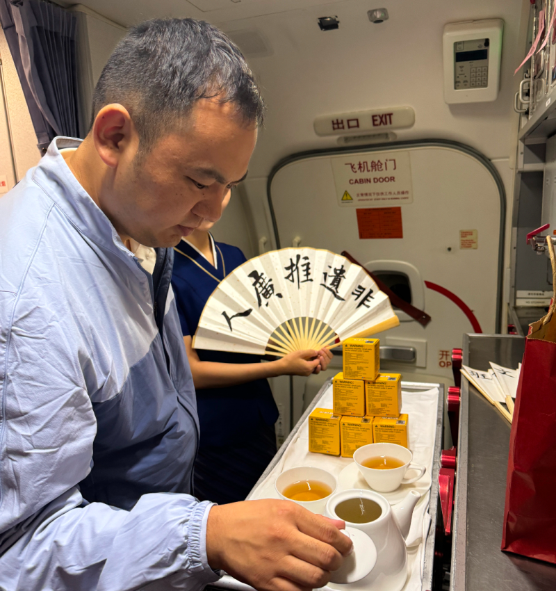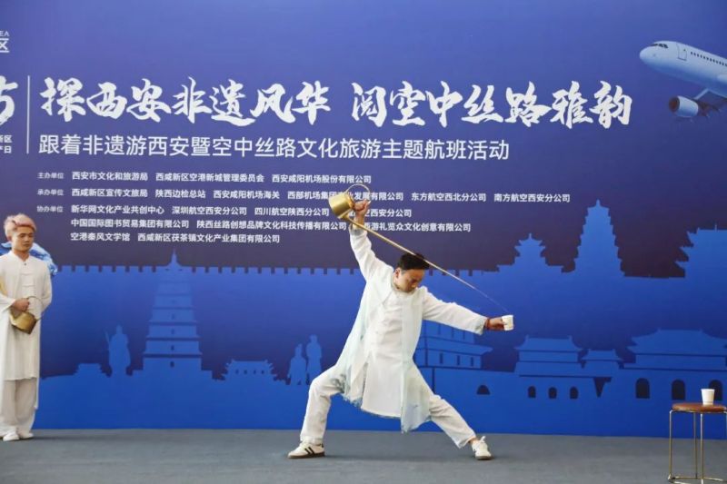 活动现场,非遗表演和展示精彩纷呈。非遗传承人带来的功夫茶表演,展现了中华民族优秀的烹茶文化。空乘人员身着华服,展示了大雁塔茶具套组、麦秆画、镂空梅瓶、茯悦茯茶等非遗文创产品,让观众领略了非遗与现代生活的融合之美。
