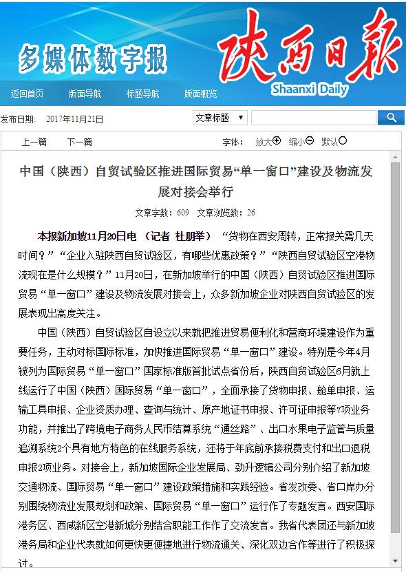 11月20日,陕西省政府商务代表团赴新加坡举办中国(陕西)自由贸易试验区推介活动。本次活动除召开推介大会外,还组织了金融创新、推进国际贸易“单一窗口”建设及物流发展两个对接会。空港新城党委委员、管委会副主任艾晨带队参加活动,并向新加坡政府部门和企业介绍了空港新城。