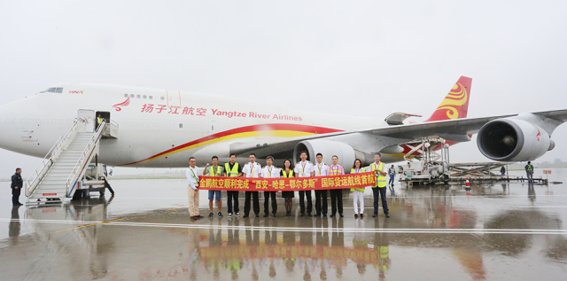 该货运航线由B747全货机执飞,计划每周运行一班,主要运输电子及机械类产品,该航班在首发当日即实现出港货量近100吨。