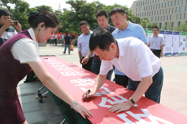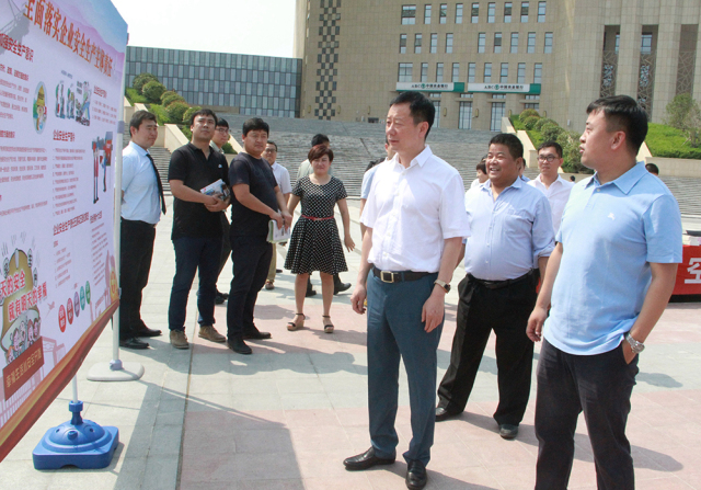 贺键一行首先在印有“全面落实企业安全生产主体责任”活动主题的条幅上郑重签上了自己的名字,之后详细观看了安全生产主题宣传展板,并在宣传咨询点领取了宣传折页,驻足了解新城“安全生产月”及宣传咨询活动开展情况,他对活动形式、活动内容给予了充分肯定。