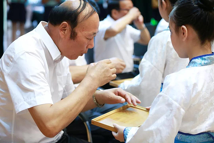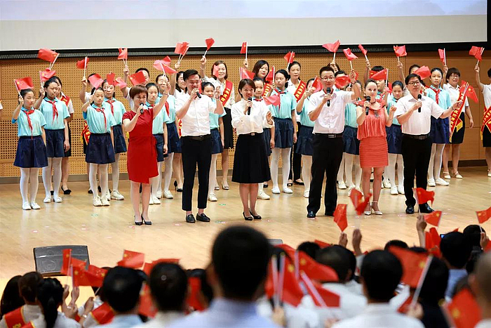 在表彰大会现场,来自太平镇孙家小学的学生们表演了茶艺展示《茶说》并向老一辈教师敬茶,感谢他们为教育事业坚守一生的无私奉献,教师代表还献唱了歌曲《不忘初心》,整场活动在全场大合唱《我和我的祖国》中圆满落幕。