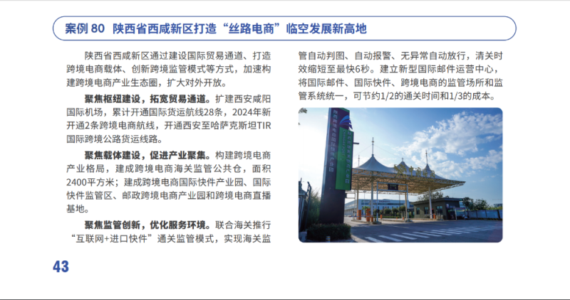 以空港新城为主要承载区的“陕西省西咸新区打造‘丝路电商’临空发展新高地”案例被收录于《案例集》的第七部分——“政府引导/加强制度创新,促进协同发展”,标志着空港新城7年来的跨境电商综试区创新示范先行区建设成果获得权威认可。