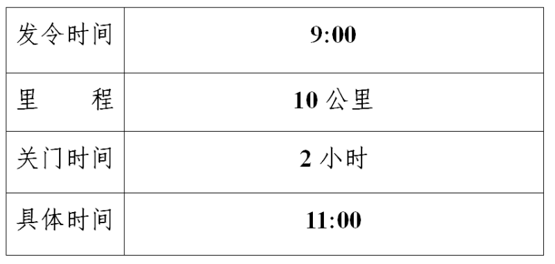 注:为确保参赛运动员比赛安全、顺利,比赛期间路线各段设置关门时间,限时对社会交通封闭。参赛者未在规定的关门时间跑完,请立即停止比赛,退出赛道,以免发生危险。退出比赛者可乘坐组委会提供的收容车到相应项目的终点处。