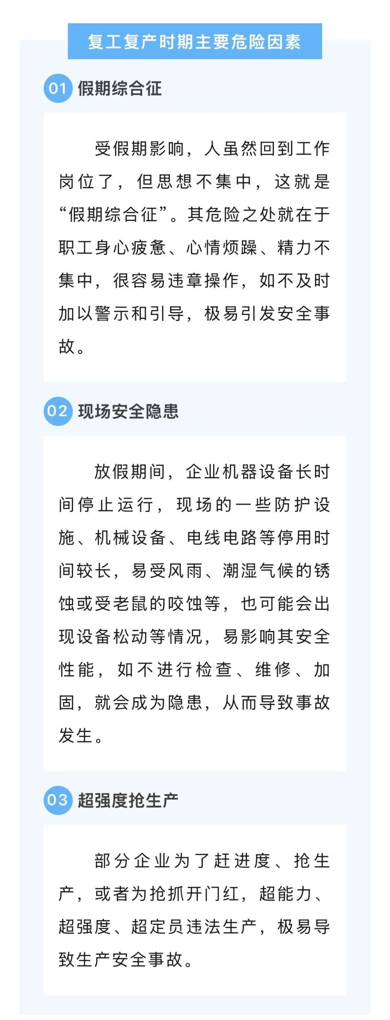 正月初九各行各业进入复工复产高峰期,铆足干劲争取节后“开门红”。但复工复产阶段是安全生产关键期、事故易发期,假期后设备及员工状态、企业赶工期等因素易导致安全事故。强调节后复工要跑出“加速度”更要守好安全“生命线”,并提及有安全提示。 |