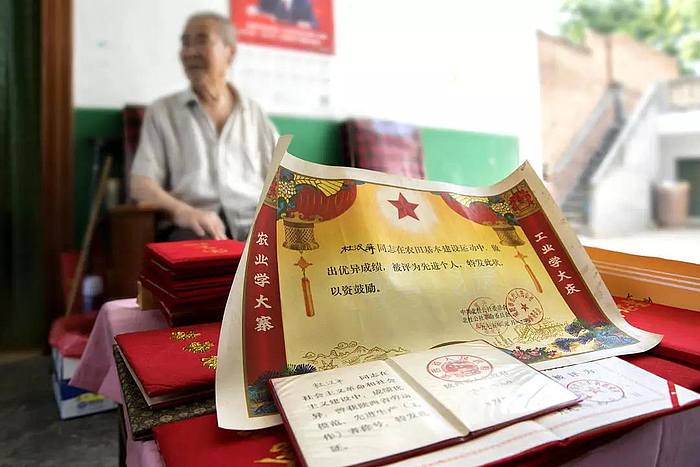 谈及老人的工作情况,一个摆满各种荣誉证书和奖状的小桌被搬了过来。细数之下,共有29个荣誉证、14张奖状。最珍贵的是两张老照片,一张是1958年11月22日,周恩来总理与全国社会主义建设积极分子合影,另一张是同年10月22日陈云、李先念与陕西省第二次青年社会主义建设积极分子大会合影。老人至今还记得,陈云副总理的关心:“农村娃,吃饱!”。