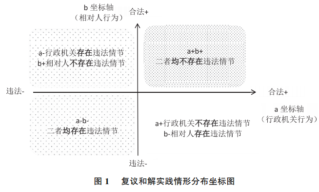 但“纠错型和解”显然只是其中一种,不能代表和解的“理想类型”。如图所示,和解在第一象限(a+b+)一般不会出现,而在第二象限(a-b+)和第三象限(a-b-)中,行政机关往往因认识到自身确存在违法才选择和解。对于第四象限的情形,相对人确有错误,而行政机关没有明显违法情节的情况下,很少适用和解。是以,实践中的行政复议和解制度并未完全激活,相对人在和解中的主动性地位被淡化,缺失基于“意定”的中间层次。