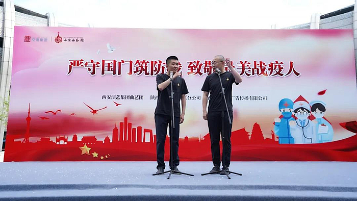 6月19日,由西安演艺集团曲艺团主办的主题为“严守国门筑防线,致敬最美战‘疫’人”抗击疫情慰问演出活动在西咸新区空港新城自贸大都汇中庭广场举行。