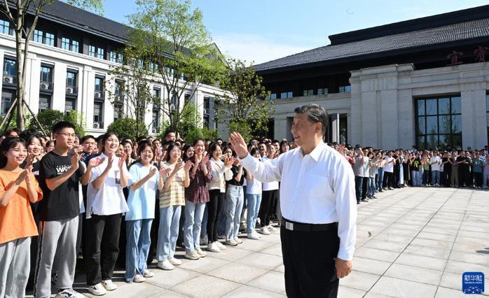 6月8日,中共中央总书记、国家主席、中央军委主席习近平在四川考察。这是8日下午,习近平在宜宾学院考察时,向师生们挥手致意。新华社记者 李学仁 摄