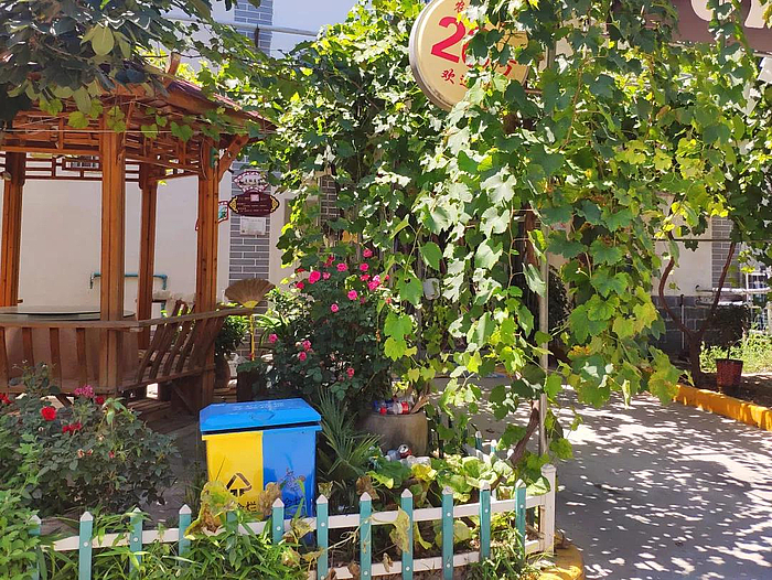 此次获评“美丽庭院”创意大赛二等奖的郭阿奇家的庭院布局规整、设施齐备,花草绿植搭配颇具巧思,三季有花、四季常绿,一片生机盎然的景象。热爱剪纸的他还将多幅剪纸作品布置在庭院的大小角落,让绿意盎然的庭院和古朴的文化气息相得益彰。庭院中的显眼位置还放置了四个分类垃圾桶,干净又卫生。