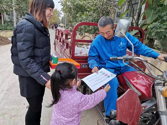 幼儿园老师们带领大班幼儿在幼儿园门前街道入户分发宣传资料,讲解垃圾分类有关知识,向广大村民讲解垃圾的危害、什么是垃圾分类、垃圾分类的必要性、如何分类以及如何处理等知识。