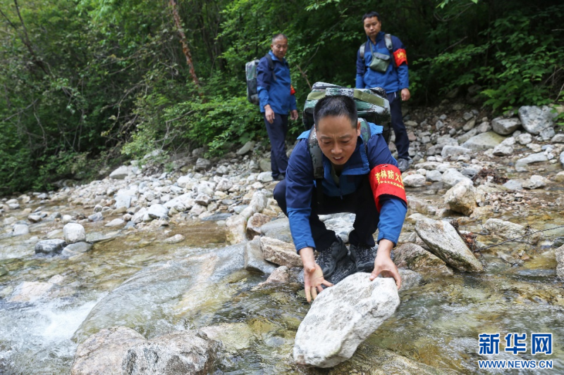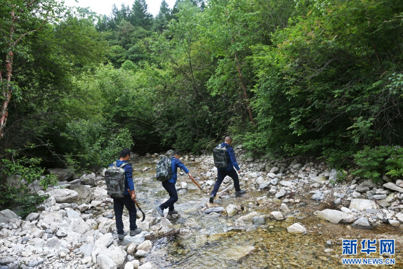 护林员巡护行程中穿越溪流。新华网 王智超 摄