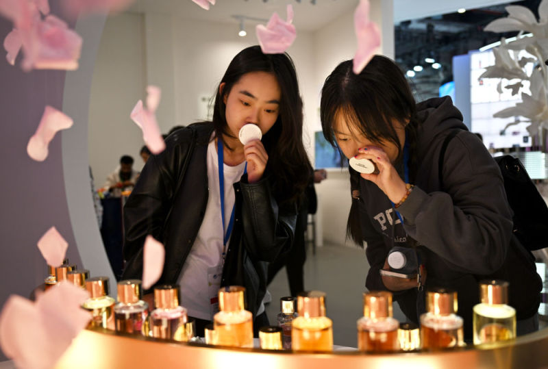 2024年11月9日,观众在第七届进博会欧莱雅展台试闻香水。欧莱雅是进博会七届“全勤生”。新华社发(陈浩明 摄)