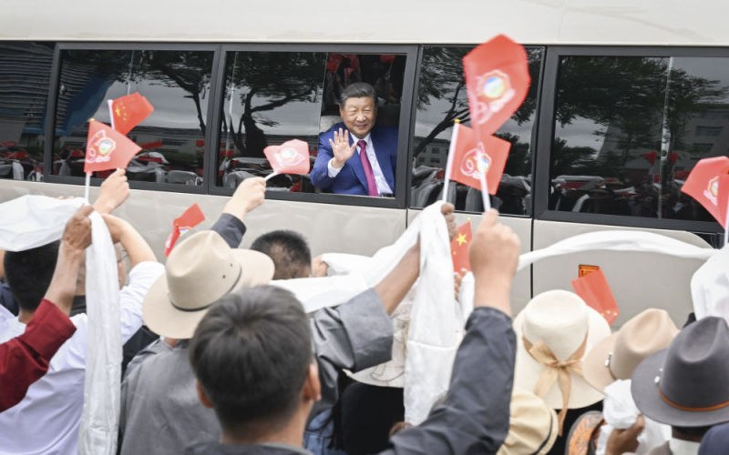 8月20日中午,中共中央总书记、国家主席、中央军委主席习近平率中央代表团乘专机抵达拉萨,出席西藏自治区成立60周年庆祝活动。这是习近平打开车窗,向沿途群众频频挥手致意。
