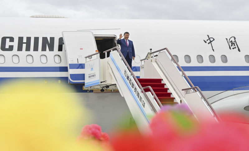 8月20日中午,中共中央总书记、国家主席、中央军委主席习近平率中央代表团乘专机抵达拉萨,出席西藏自治区成立60周年庆祝活动。这是习近平走出舱门,向欢迎群众挥手致意。