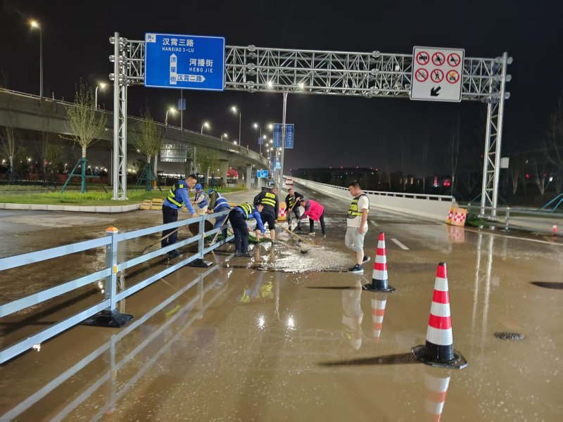 辖区汉霄一路、T5高架积水严重,执法人员第一时间对接机场动力公司、空港市政等部门,共同对积水进行清扫处理,迅速恢复道路畅通。