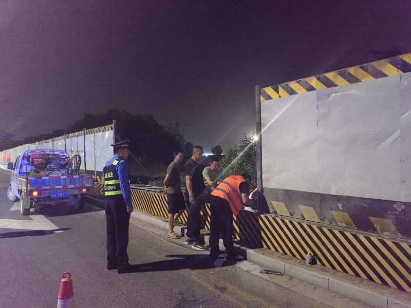 辖区个别项目工地围挡倾倒,影响交通安全,执法人员第一时间将障碍物移至安全区域,并联系项目负责人对倾倒围挡进行修复。