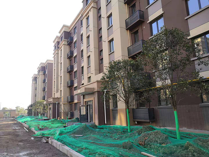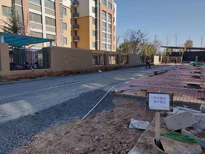 截至12月15日项目室外道路基层施工完成,进行地面铺装、绿化栽植。