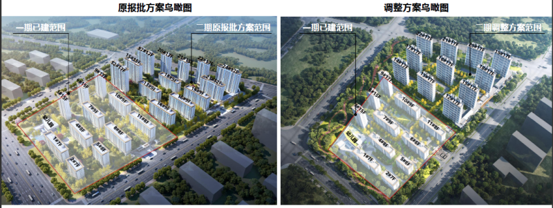 原审批方案12-24#楼合计13栋住宅,全部位于本项目北区(本次调规范围以下称为“北区”)。本次调整北区住宅楼数量由13栋调整为11栋,即12-22#楼,项目总建筑面积由199513.86调整为184515.65平方米,建筑密度由22.10%调整为20.74%,绿地率由35.00%调整为35.01,总机动车车位数由1836个调整为1537个。(具体变化情况见附件)。