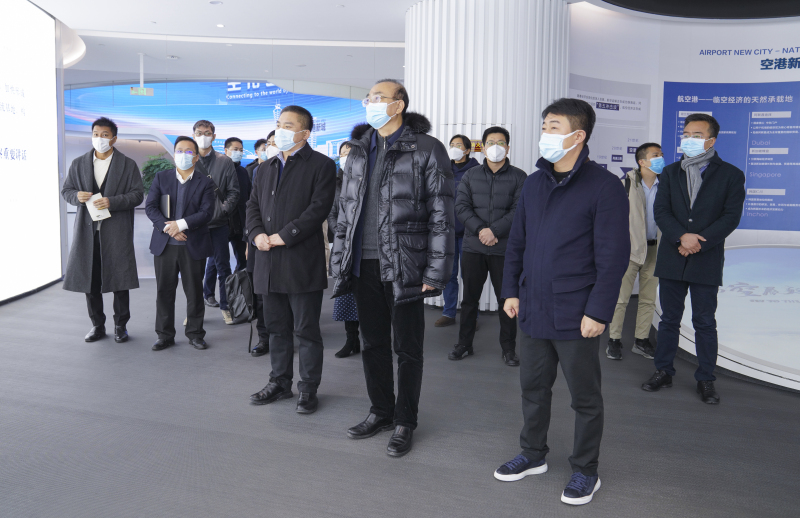 “空港这片区域是如何规划的?产业结构包括哪些?现阶段发展运营情况如何?”在空港新城临空经济展示中心,考察团结合沙盘展示和人员讲解,边看边听边问,详细了解空港新城“一核、双心、两环、五区”的区域规划和“港、产、城、人”的发展理念以及“临空、自贸、保税、口岸、跨境、航权”六大开放平台优势,重点听取了机场三期扩建工程及T5站前商务区的规划建设介绍。